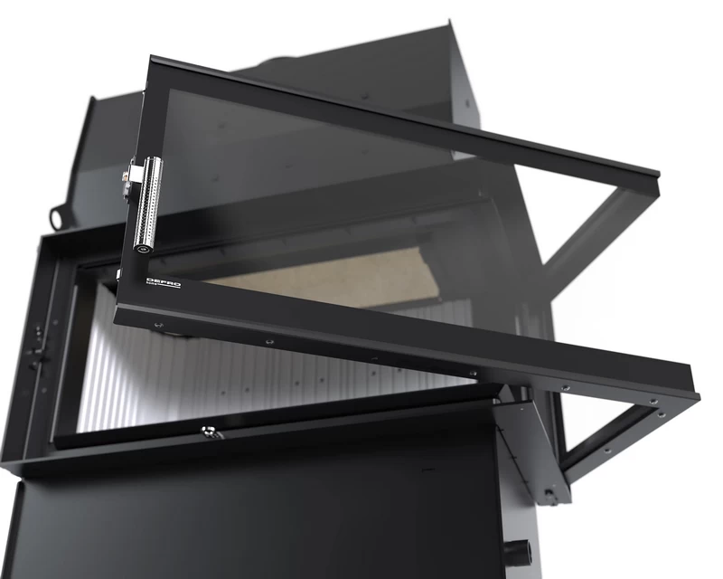 Materiale și construcție de calitate: cameră de ardere din oțel și șamotă/ceramiton, magazine de aerizare cu opțiune de priză aer extern, deflectoare și sistem de curățare a sticlei — pentru ardere curată și întreținere redusă.